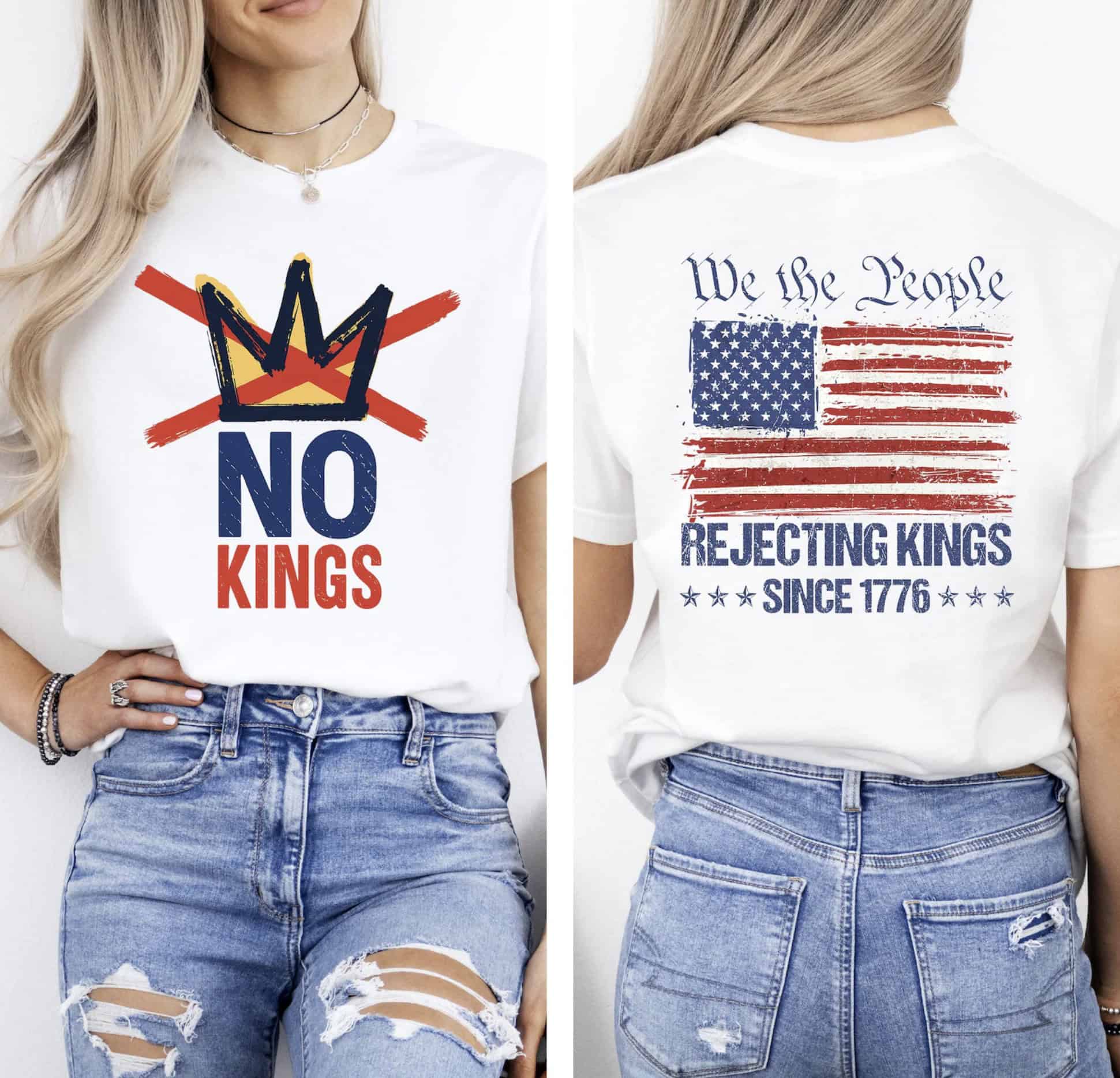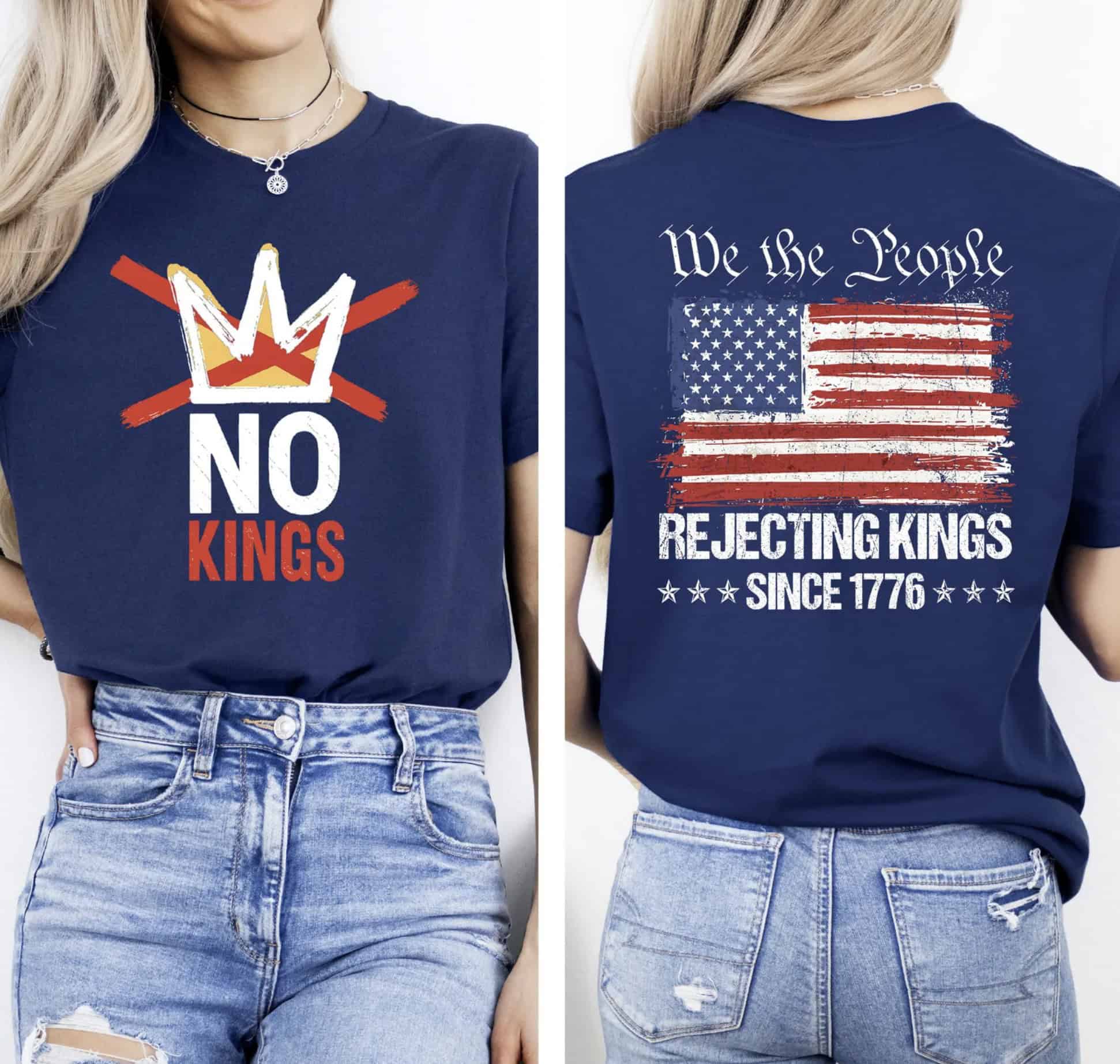 Bold “No Kings – Rejecting Kings Since 1776” slogan